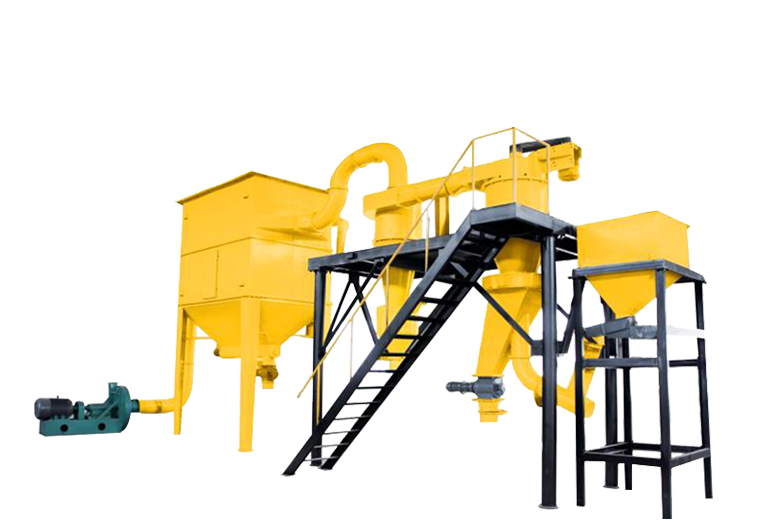 整套分級裝置由氣流分級機、旋風收集器、脈沖除塵器、高壓引風機、電控柜等組成。氣流分級機是帶有二次進風及立式安裝的大葉輪轉子的強制型分級機。